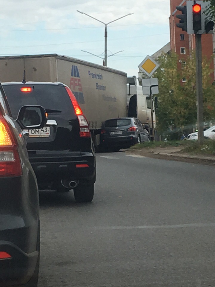 В субботу, 8 сентября 2018 года, в Кирово-Чепецке столкнулись грузовик MAN и Nissan Qashqai. Фото с места происшествия прислала читательница Кристина Калаабина.