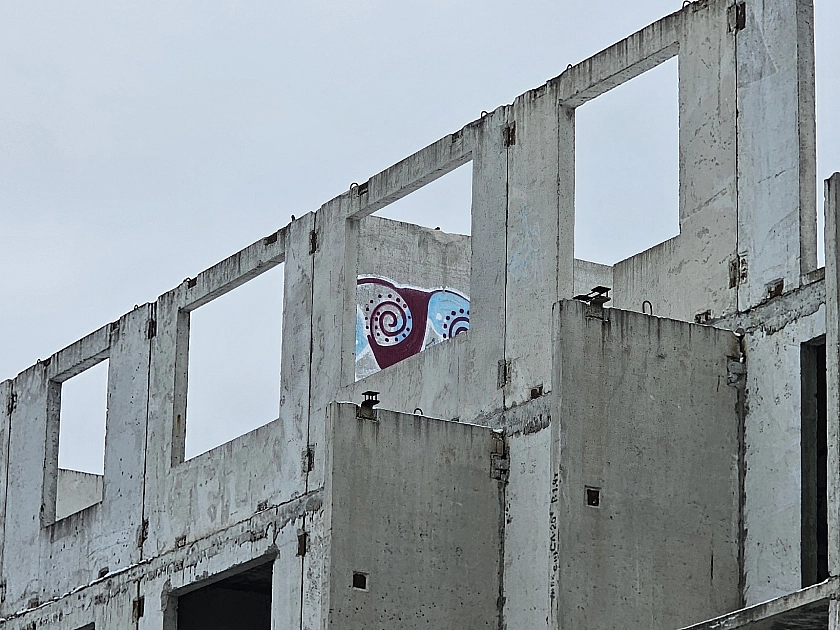 На фото видно, что на недострой любят подниматься местные жители. Все стены внутри разрисованы. Администрация города огородила территорию забором, но чепчанам это не помеха.