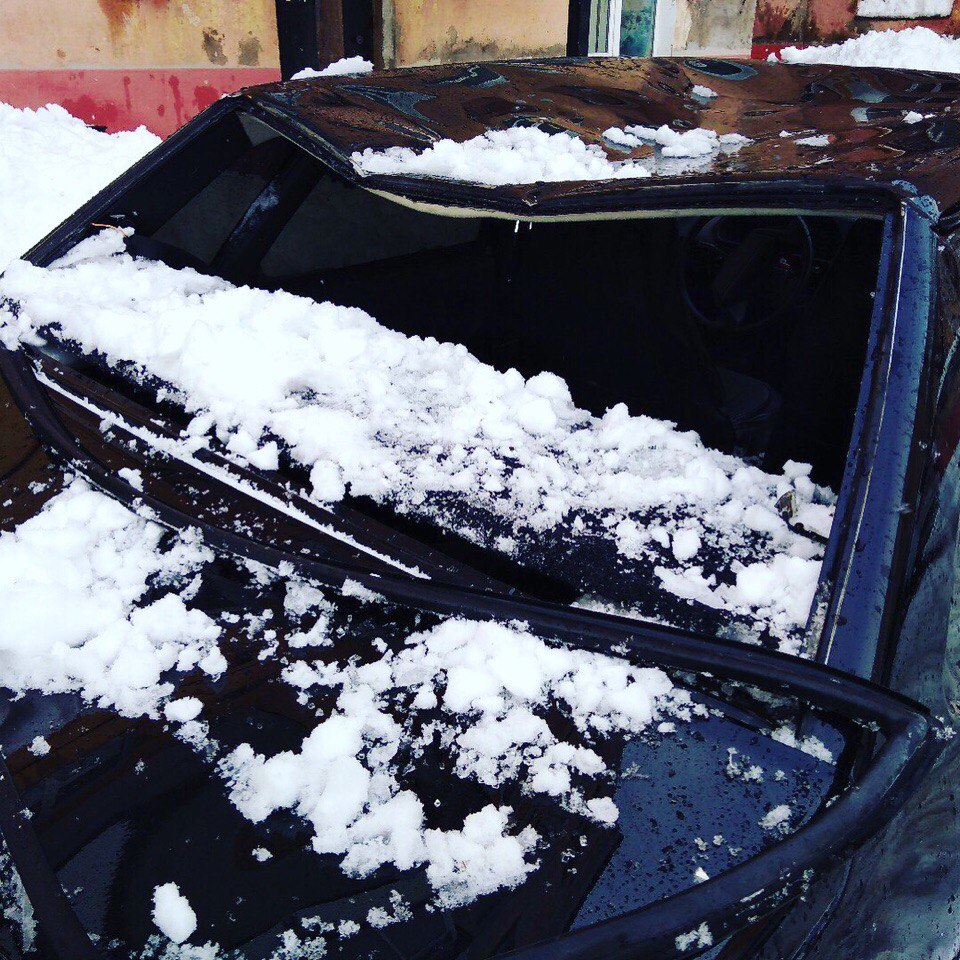 Инцидент произошел утром, авто было припарковано у дома, на котором велись работы. Высотники чистили крышу и не заметили, что пласты снега падают на легковой автомобиль.