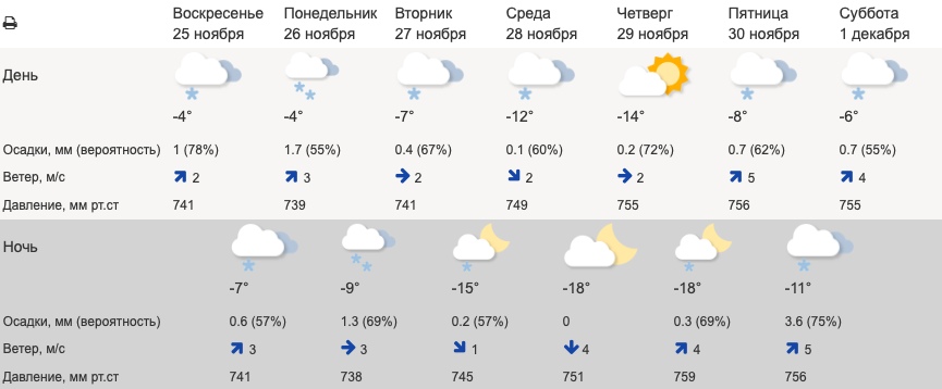Прогноз погоды с 26 по 30 ноября