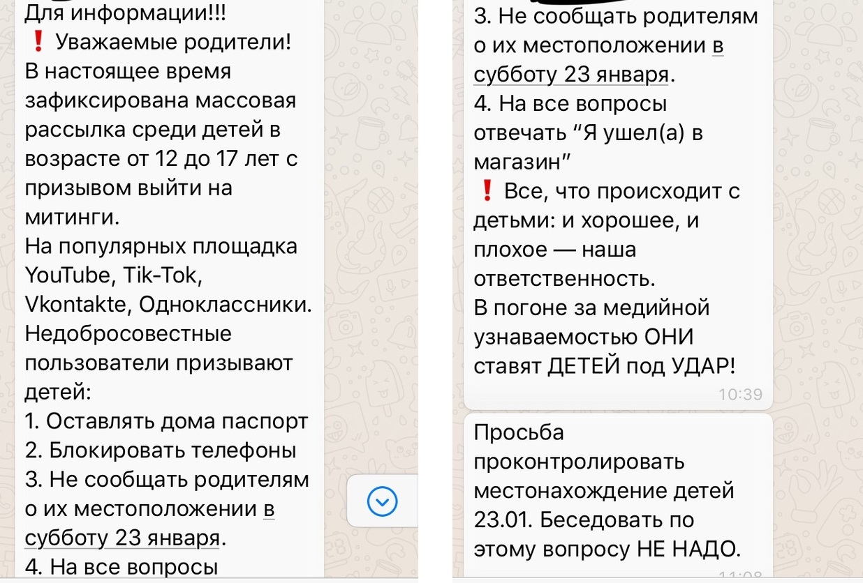 Информация о запрете беседы по поводу несанкционированного митинга в субботу, 23 января, появилась в родительских чатах. Также там сообщают о массовой рассылке информации о событии в соцсетях: