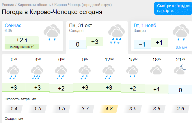 Первый день рабочей недели в Кирово-Чепецке выдастся пасмурным и дождливым, температура воздуха 0...+3 градуса. Прогноз погоды на понедельник, 31 октября, опубликовали на сайте "Гисметео".