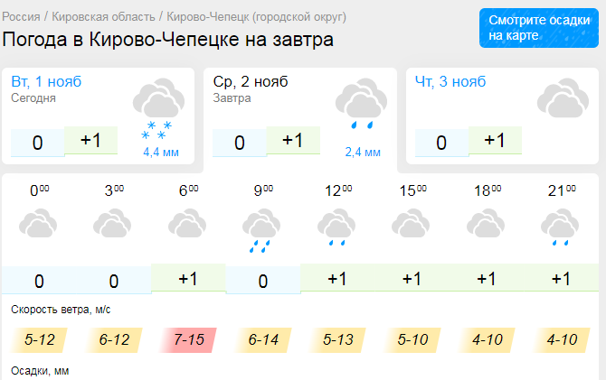 В Кирово-Чепецке пасмурно, пройдет дождь. Ночная температура воздуха составит 0 градусов, к утру столбик термометра поднимется до +1 градуса. Днем и вечером температура воздуха останется на той же отметке – +1 градус.