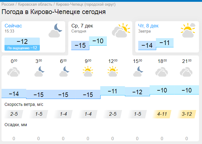 В Кирово-Чепецке будет переменная облачность, осадков не прогнозируется. Температура воздуха в городе будет колебаться от -11 до -14 градусов. Ночью температура воздуха в Кирово-Чепецке составит -14 градусов. Утром температура воздуха составит -15 градусов. Дневная температура воздуха составит -11...-12 градусов. К вечеру столбик термометра опустится до -10 градусов.