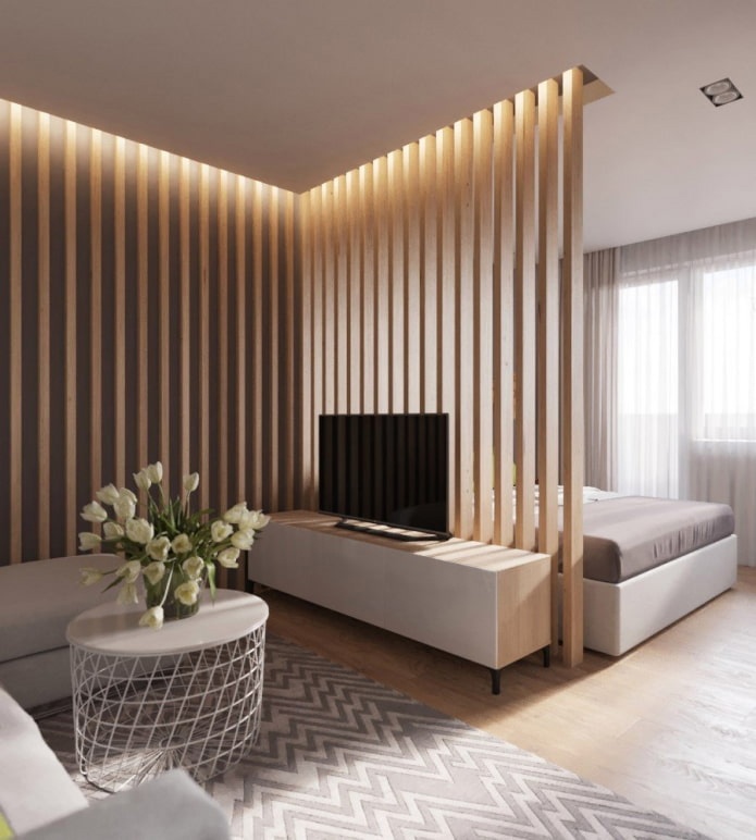 Гармонично разбить жилую площадь на функциональные зоны можно с помощью декоративных реек или панелей.