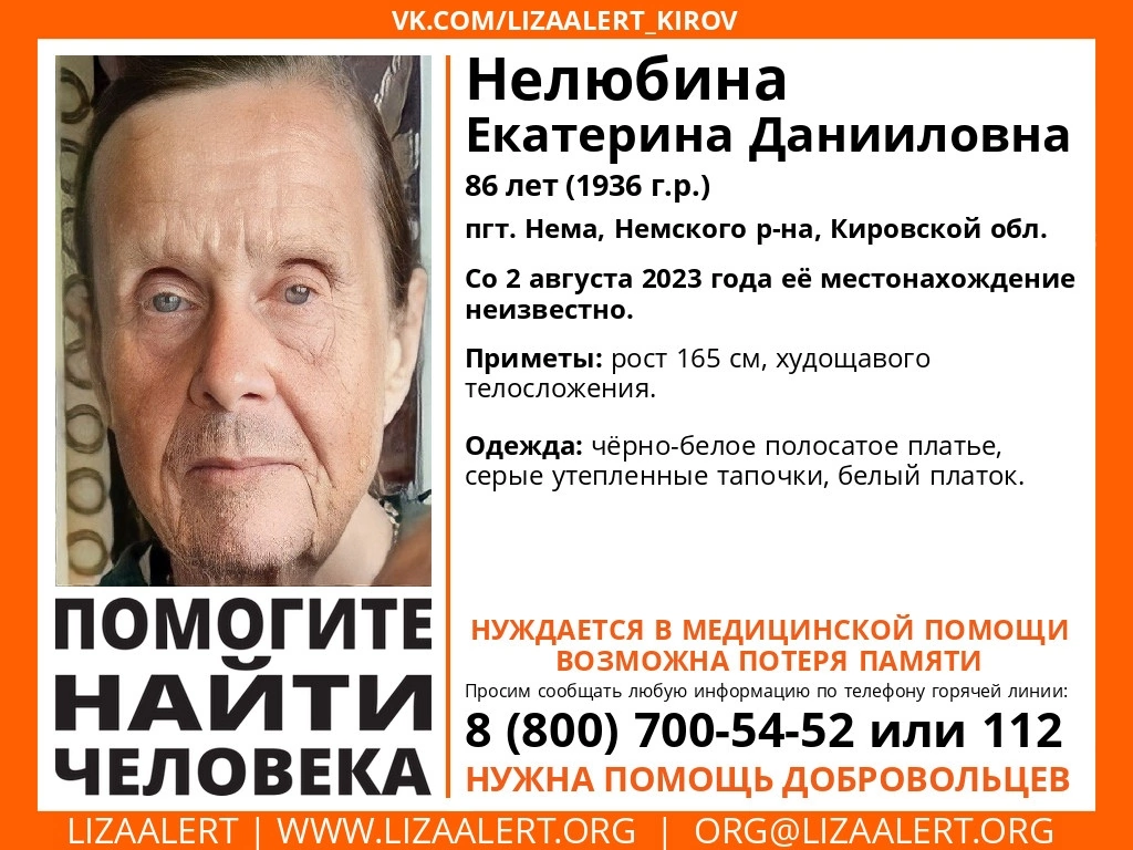 2 августа в пгт Нема пропала Екатерина Данииловна Нелюбина с возможной потерей памяти. 86-летняя местная жительница нуждается в помощи медиков.