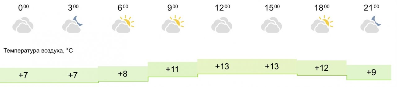 Ночная температура воздуха составит от +7 до +8 градусов, к утру столбик термометра остановится на отметке +11, к жителям города может выйти солнце. Днем ожидается до +13 градусов, будет пасмурно. Вечером температура будет колебаться в диапазоне от +9 до +12 градусов.