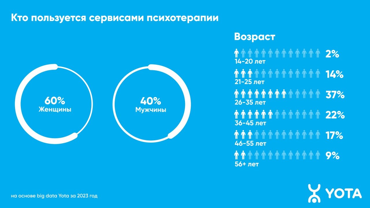 В Кирове, как и в целом по стране, психологическими сервисами чаще пользуются женщины, они составляют 60% аудитории и обеспечивают 63% интернет-трафика этих ресурсов. Наибольший интерес к онлайн-психологии проявляет аудитория 25-35 лет (37% от всех пользователей). На втором месте — абоненты от 36 до 45 лет (22%), а замыкает топ-3 группа 46-55 лет (17%).