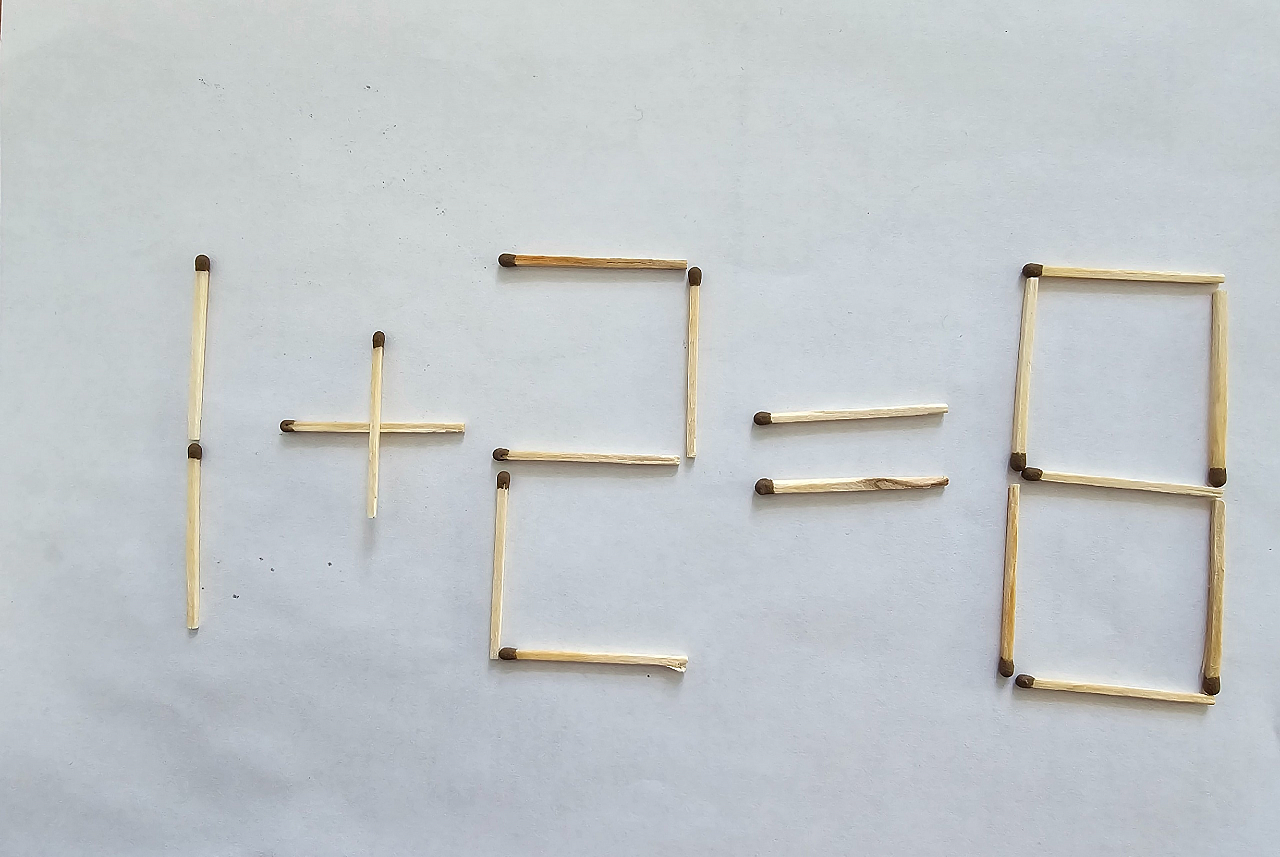 На первый взгляд оно выглядит неверным, что действительно так, ведь 1 плюс 2 в действительности равно 3. Ваша цель — исправить это уравнение, переместив всего одну спичку и сделав его правильным.