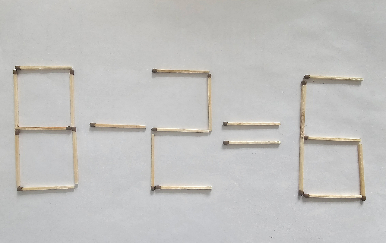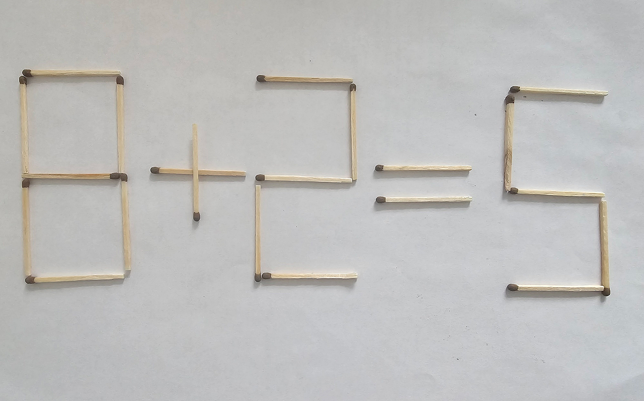 Подумайте, как можно изменить цифры или знаки, используя одну спичку. Возможно, вам удастся преобразовать уравнение так, чтобы оно стало математически правильным? Если немного поэкспериментировать с цифрами, то можно обнаружить, что "8" и "2" можно превратить в совершенно другое выражение.