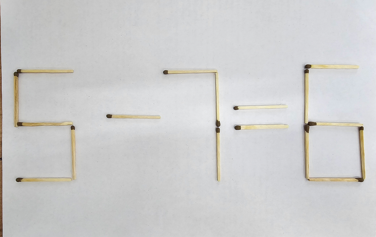 Предлагаем вам увлекательную головоломку со спичками, которая станет настоящим испытанием для вашей смекалки и креативности! В данной задаче вам предстоит исправить неверное уравнение: "5-7=6".