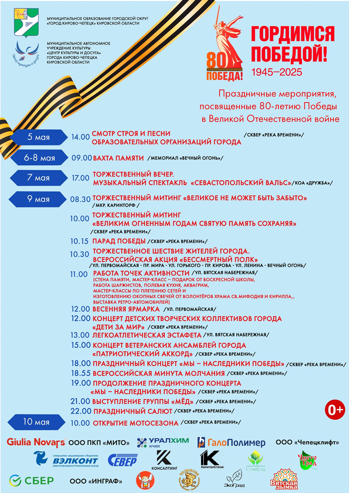 В Кирово-Чепецке пройдет ряд мероприятий, посвященных 80-летию Победы. Афишу представил местный городской центр культуры и досуга.