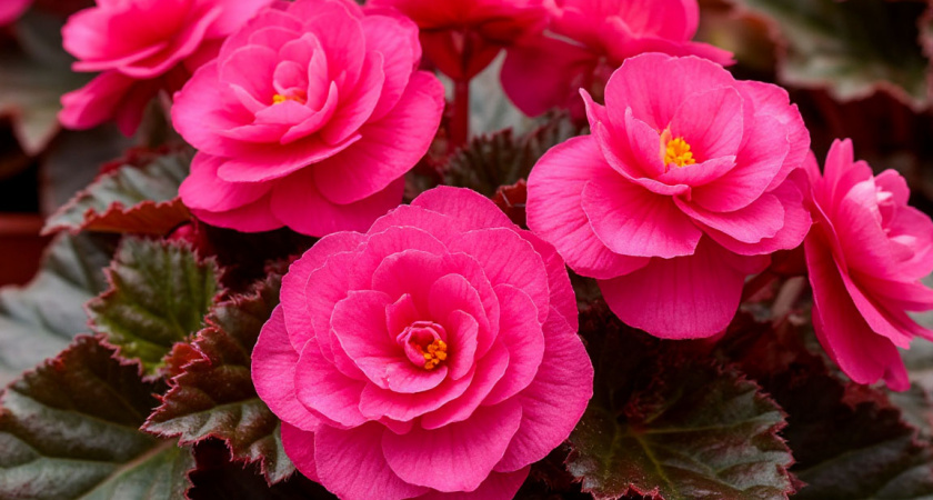 Одни из самых эффектных тенелюбивых растений – бегонии. Например, Соления Дарк Пинк радует обильным цветением с мая до первых заморозков. Ее нежные розовидные соцветия раскрываются лишь на рассвете, наслаждаясь утренним солнцем, а остальное время проводят в тени. На открытом солнце эта бегония быстро теряет декоративность, поэтому ей необходима плодородная почва, регулярный полив и минеральные подкормки.