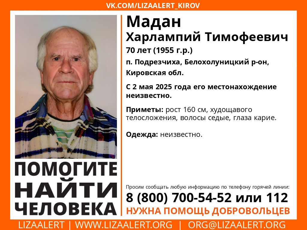 Согласно данным волонтеров, Харлампий Тимофеевич Мадан пропал без вести с пятницы, 2 мая 2025 года. Мужчину, родившийся в 1955 году, ищут в поселке Подрезчиха Белохолуницкого района.