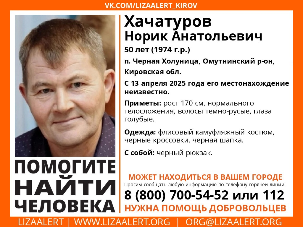 Пропал Норик Анатольевич Хачатуров, 50 лет (родился в 1974 году). Он проживает в поселке Черная Холуница Омутнинского района Кировской области. С 13 апреля 2025 года его местонахождение неизвестно.