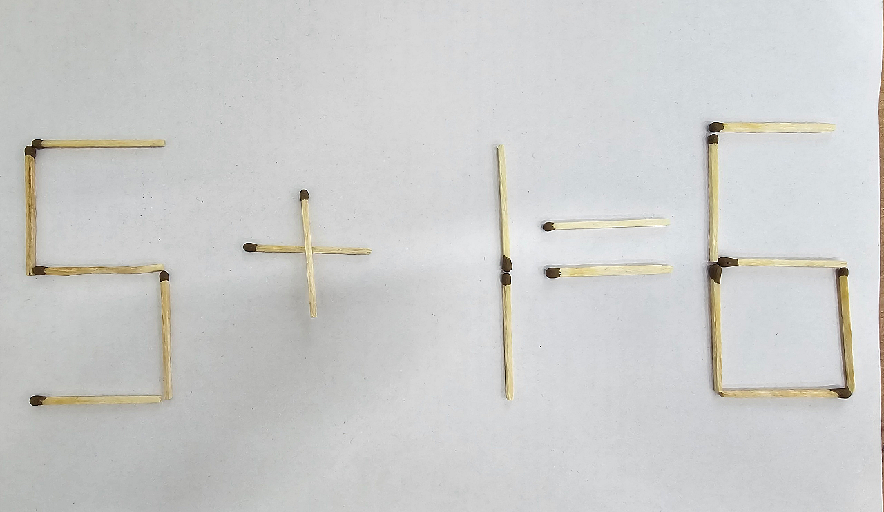 Решение: перенесите одну спичку из числа "7", чтобы превратить его в "1", и получите "5+1=6". Это показывает, что иногда для достижения верного ответа необходимо посмотреть на задачу под другим углом зрения.