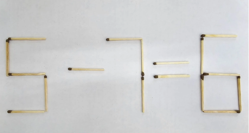 Приглашаем вас испытать свои умственные способности с помощью занимательной головоломки со спичками, которая станет вызовом для вашей сообразительности и изобретательности! Ваша цель – привести в порядок неверное равенство: "5-7=6".