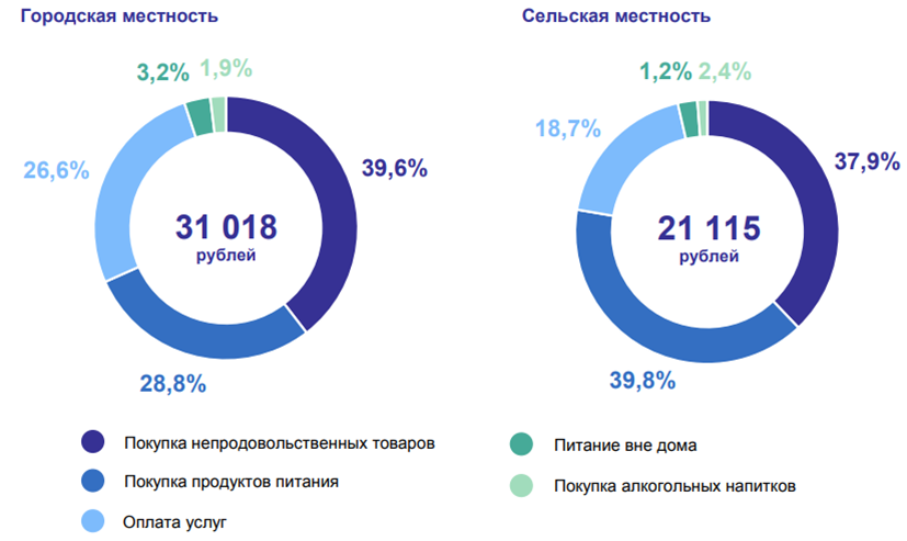 Также в исследовании говорится, что житель городской местности расходовал в среднем на 9,9 тысячи рублей больше, чем житель сельской местности. Структура расходов по категориям трат представлена ниже.