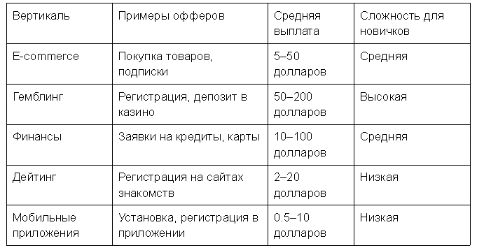 - Выберите вертикаль. Новички могут начать с дейтинга или мобильных приложений — низкий порог входа, выплаты по 0.5–20 долларов, с опытом онлайн продаж могут стартовать с 5–50 долларов, в сфере финансов с 10–100 долларов или в гемблинге с 50–200 долларов.