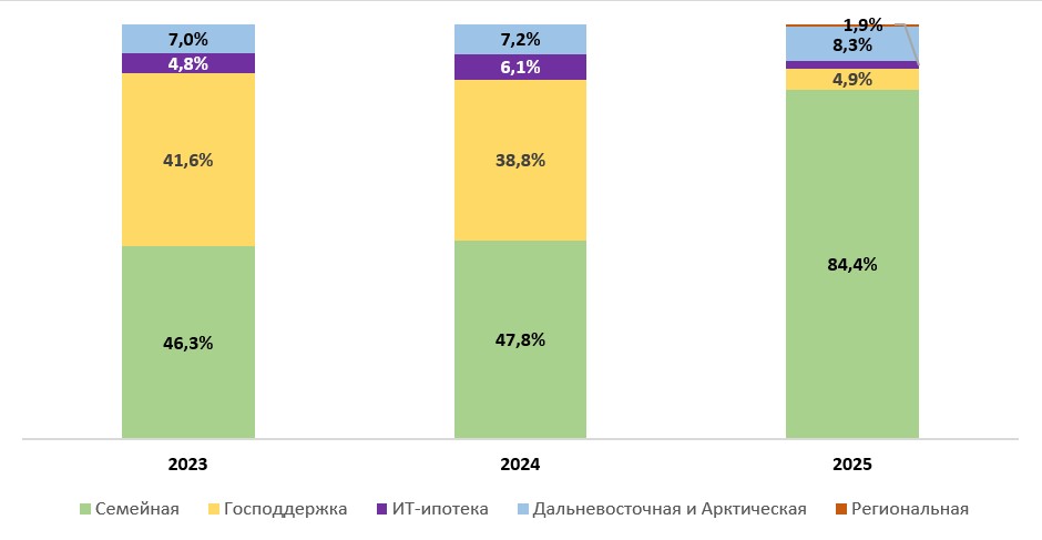 Как и в 2023 и в 2024 годах, "Семейная ипотека" продолжает оставаться наиболее востребованной льготной программой, однако ее доля в общем объеме выдач Сбера существенно изменилась по отношению к предыдущим годам. По данным Домклик, до отмены программы "Господдержка" в июле 2024 года доля "Семейной ипотеки" составляла 46,3% по январю-маю 2023 года и 47,8% по аналогичному периоду 2024 года. Доля же "Господдержки" превысила 40% за январь-май 2023 года, а в 2024 году за то же время составила почти 39%. После отмены "Господдержки" практически все выдачи льготной ипотеки стали приходиться на "Семейную ипотеку" – 84,4% в первой половине 2025 года (январь-конец мая).