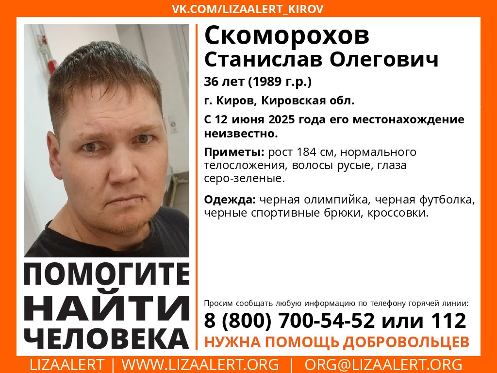 В Кировской области ведутся поиски 36-летнего Станислава Олеговича Скоморохова, о местонахождении которого нет информации с 12 июня 2025 года. Об этом сообщили волонтеры поисково-спасательного отряда "ЛизаАлерт" по региону.