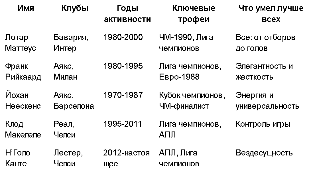 Маттеус, Макелеле, Канте — каждый был номером один в свое время. Выбор зависит от того, что вам ближе: универсальность, дисциплина или энергия.
