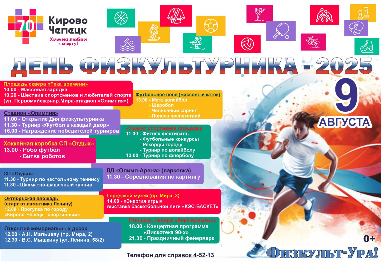 В понедельник, 28 июля 2025 года, в пресс-службе администрации Кирово-Чепецка опубликовали список мероприятий на День физкультурника (0+) 9 августа. Что подготовили в мэрии для спортивных горожан?