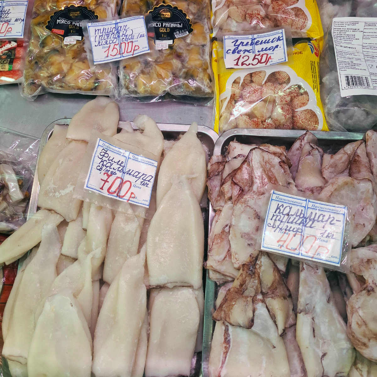 С точки зрения ассортимента и удобства режима работы предпочтение было отдано рыбному рынку, где автору удалось обзавестись «своим» продавцом и насладиться щедрыми дегустациями. В продаже представлены разнообразные деликатесы: камчатские крабы и стригуны, креветки разных видов, кальмары, морские гребешки, чавыча и даже необычные продукты, такие как сало тюленя.