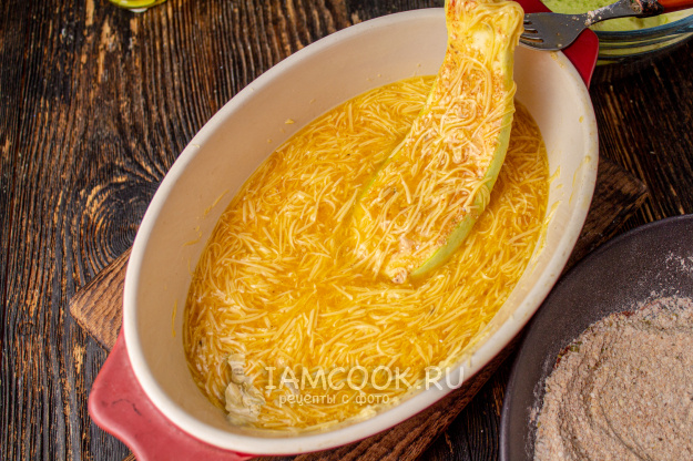 Для кляра используется смесь четырёх яиц и 100 граммов тёртого сыра на выбор — твёрдого или любого по вкусу. Ингредиенты взбиваются в глубокой миске, достаточно просторной, чтобы кабачки свободно макались в кляр.
