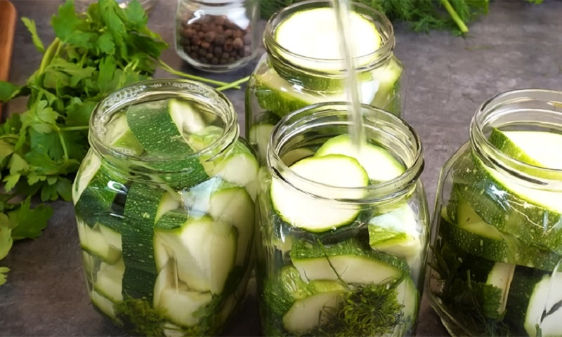 Воду из банки сливают в кастрюлю, добавляют соль и сахар, доводят рассол до закипания, после чего вливают уксус. Полученным кипящим маринадом заливают кабачки в банках и тут же укупоривают. После закатки банки переворачивают и укутывают тёплым полотенцем, чтобы они остывали медленно, способствуя лучшему смешению ароматов.