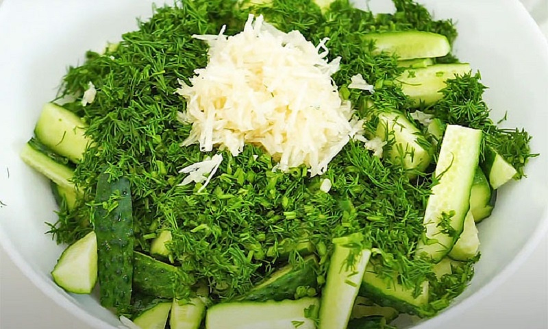 Далее добавляют измельчённый чеснок и свежий укроп — чем больше пряной зелени, тем насыщеннее вкус и воздух блюда наполнится летней свежестью. Затем в миску всыпают соль и сахар, вливают растительное масло и уксус. Внимательно перемешивают несколько раз, чтобы все кусочки огурцов покрылись маринадом.