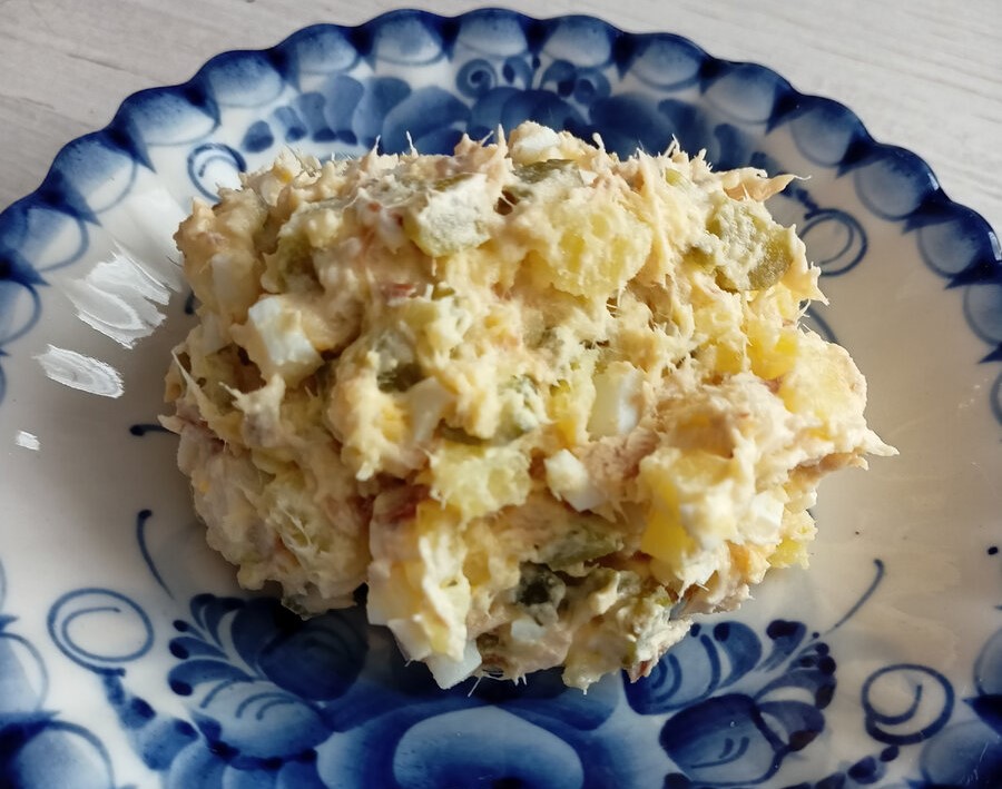 Все ингредиенты соединяют в глубокой миске, тщательно перемешивают и заправляют майонезом. Солят по вкусу, стараясь не переборщить, чтобы подчеркнуть природные ароматы рыбы и овощей.