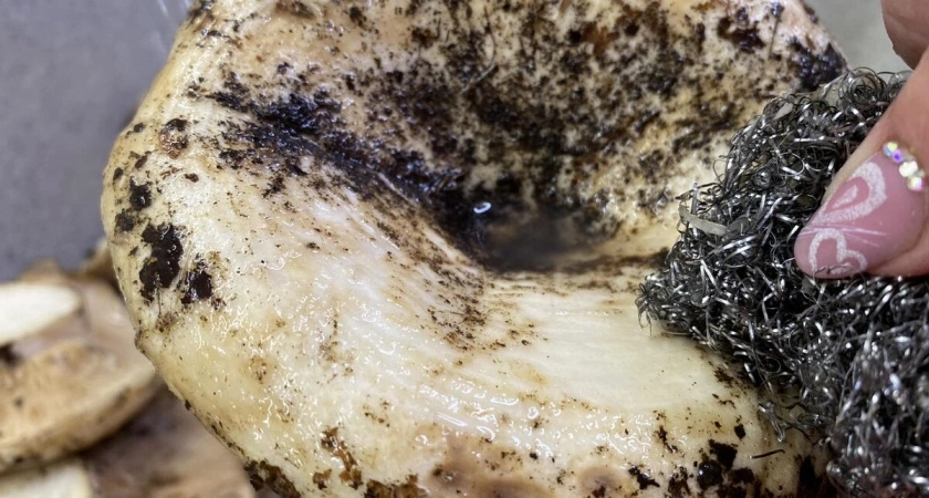 Ситуацию спасла находка, которая случайно оказалась под рукой — обычная металлическая губка для посуды. Достаточно слегка провести ею по шляпке и ножке гриба, и всё лишнее исчезает. Не нужны ножи, тряпки, щётки и замачивания. Гриб остаётся целым и чистым, готовым к засолке или жарке.