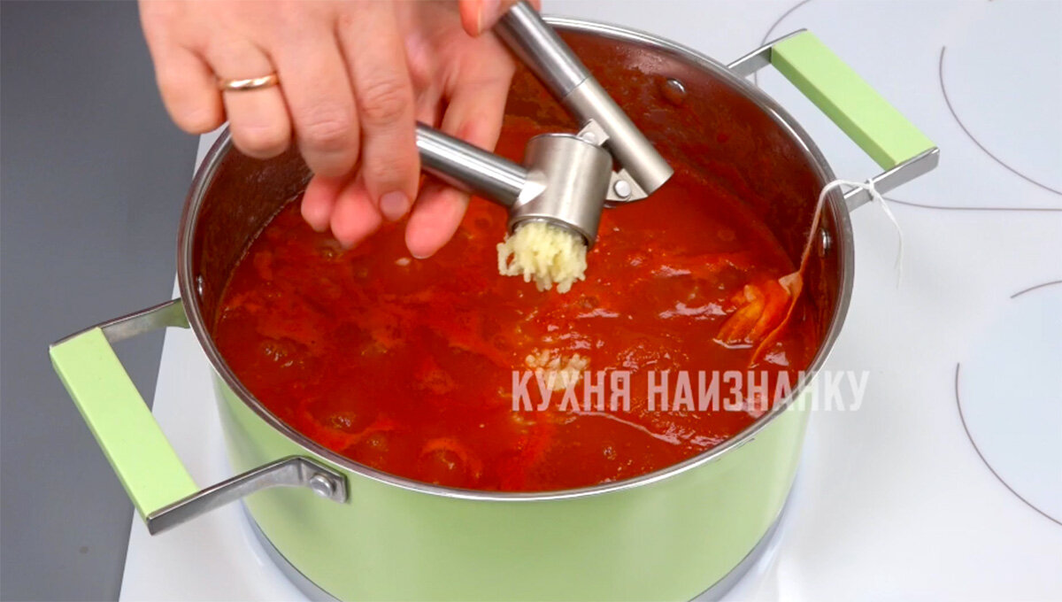 Соус варят со специями ещё 10 минут, затем добавляют свежий чеснок через пресс и готовят ещё 2–3 минуты. Чтобы добиться однородной текстуры, массу снова перебивают блендером и прямо перед завершением вливают уксус. После этого соус сразу разливают по стерилизованным банкам.