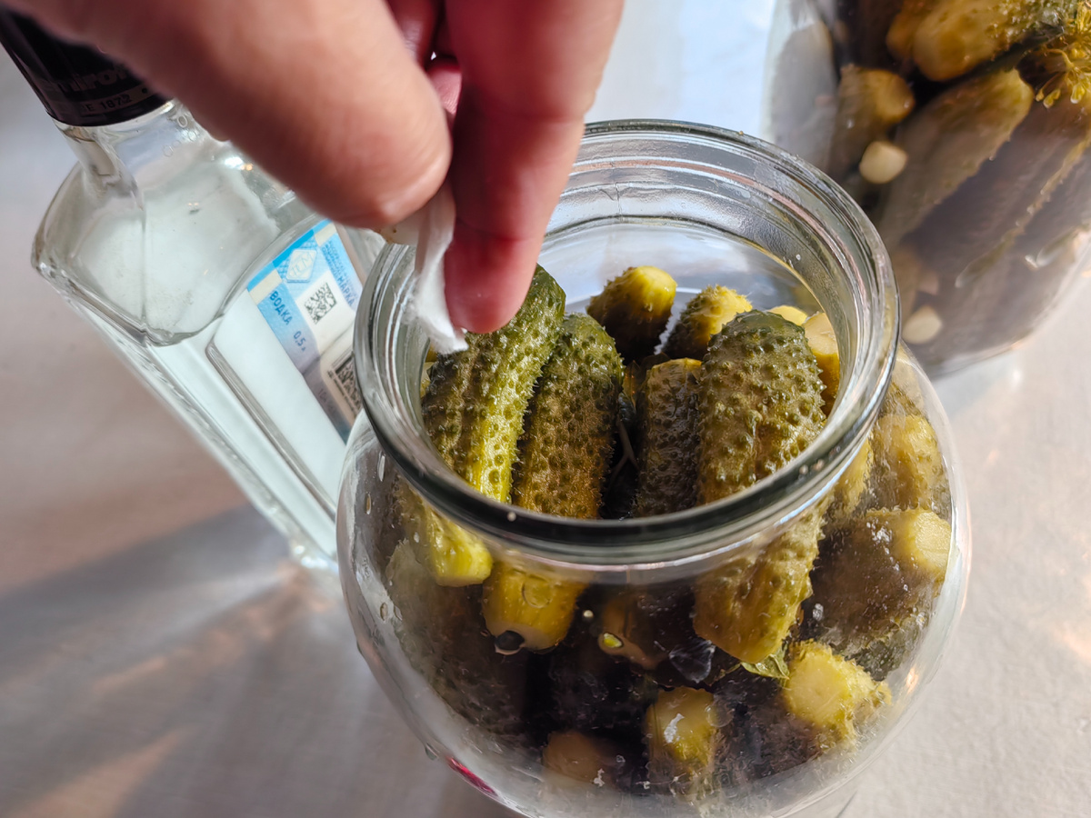 В емкости с огурцами удаляют пену и осадок, промывая стенки банки кипятком. Особое внимание уделяется горлышку — его протирают ватным тампоном с водкой или другим спиртовым раствором для обеззараживания.