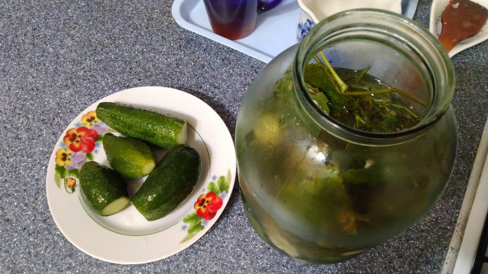 Вначале на дно банки кладут половину специй, затем плотно укладывают огурцы вертикально, сверху кладут оставшуюся зелень. Рассол готовят из холодной воды с растворённой солью и горчичным порошком, который равномерно распределится с течением времени. Банку закрывают капроновой крышкой, обдают её кипятком для санитарной обработки, но не стерилизуют, чтобы полезные бактерии не погибли.
