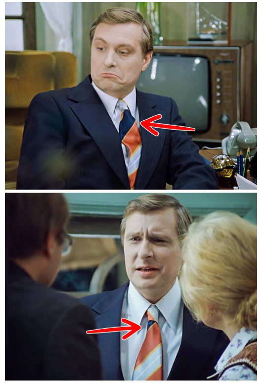 Другой заметный киноляп связан с галстуком Самохвалова — центрального персонажа картины. В сценах его галстук сначала представлен в тёмно-синем цвете с полосками, а уже вскоре неожиданно приобретает оранжевый оттенок. Как и почему происходит такая быстрая смена аксессуара остаётся загадкой, которая порождает улыбку у зрителей, привыкших к безупречной режиссуре, но не к техническим мелочам.