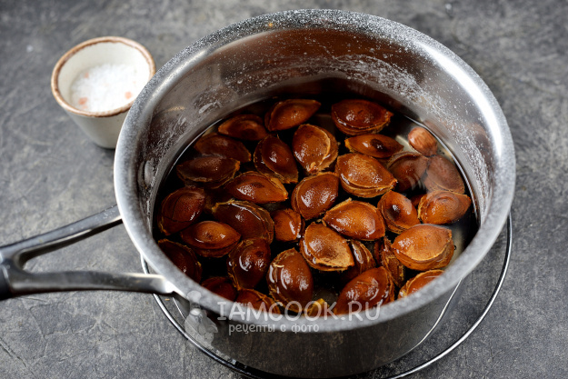Перед варкой ядра аккуратно надрезают, чтобы соль могла проникнуть внутрь. С помощью молотка по одной из трех складок косточки слегка надколачивают, избегая полного раскола. Это ключевой момент: скорлупа должна треснуть, но остаться целой, иначе ядро потеряет текстуру.