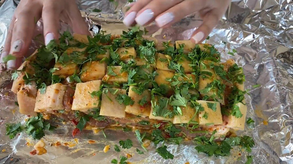 Сверху мелко нарезают зелень — чаще всего используют кинзу, но можно выбрать любую по вкусу. Мясо плотно заворачивают в двойной слой фольги и отправляют в духовку ровно на час.