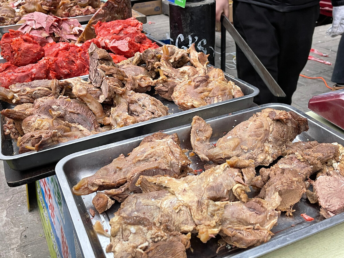 Несмотря на то, что мясо в Китае стоит достаточно дорого, на рынке можно было найти свинину, курятину, а также разнообразные копчёности и сушёные деликатесы из говядины.