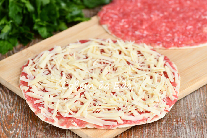- Сыр крупно натирают и половину от общего количества выкладывают на одну из лепешек с фаршем.