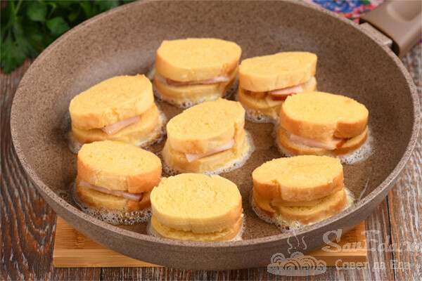Для панировки яйца взбивают с молоком и солью. Каждый бутерброд окунают в смесь, затем жарят на сковороде с маслом под крышкой, до золотистой корочки с обеих сторон. В итоге получаются аппетитные, сочные и сытные гренки, отлично подходящие для завтрака или быстрого перекуса.