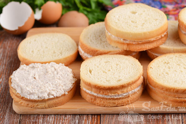 Творог смешивают с сахаром, сметаной и корицей. В творожную массу можно добавить какао, ваниль, сухофрукты или ягоды. Для основы используют нарезанный батон или багет. На половину ломтиков выкладывают творожную начинку, накрывают второй половиной и прижимают, удаляя выступающие края массы.