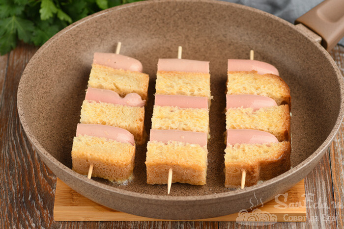 Для этого варианта берут два ломтика хлеба и шесть мелких сосисок. Хлеб нарезают на три части, чередуя с кусочками сосисок, и фиксируют шпажками. Каждый «шашлычок» окунают со всех сторон во взбитое с солью яйцо с водой, после чего обжаривают на сковороде в масле до золотистого цвета. Получаются необычные, удобные в подаче гренки с хрустящей корочкой снаружи и ароматными сосисками внутри. Это быстрый и впечатляющий завтрак, который понравится и детям, и взрослым.