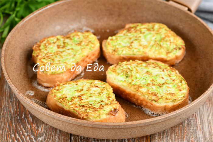 Кабачок натирают на крупной терке, отжимают лишнюю влагу, затем смешивают с яйцом, солью и сухими или свежими травами (например, орегано). Смесь выкладывают на ломтики батона. Нижнюю сторону хлеба окунают в яично-молочную смесь и обжаривают на масле, сначала стороной с кабачковой начинкой вниз, закрывая крышкой. Затем аккуратно переворачивают и доводят до румяности с другой стороны.