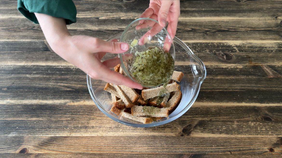 Подготовленные кусочки хлеба аккуратно перемешивают с получившейся чесночно-масляной смесью руками, чтобы не повредить структуру.
