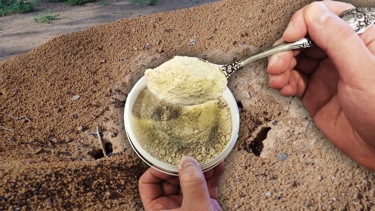 Это природная и безвредная ловушка. Сухая манная крупа смешивается с сахарной пудрой в равных пропорциях, при желании добавляют немного ванилина для усиления запаха. Смесь раскладывают по активным маршрутам муравьев. Насекомые, привлечённые сладким запахом, заносят этот «продукт» в гнездо, где крупа разбухает и губит их изнутри. Эффективность метода возрастает в конце лета, когда естественное питание насекомых сокращается.
