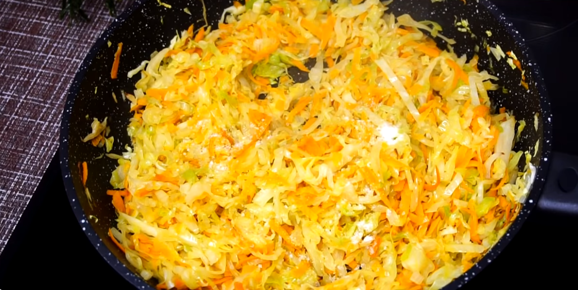 Параллельно готовится капуста: её шинкуют соломкой и слегка мнют руками. Морковь натирают на крупной тёрке, а лук нарезают мелкими кубиками. На сковороде в растительном масле сначала обжаривают лук до прозрачности, затем добавляют морковь и тушат пару минут. После этого идут капуста, соль и чёрный перец. Овощи готовят под крышкой, регулярно помешивая, около 10–12 минут до мягкости, но не до полного размягчения.