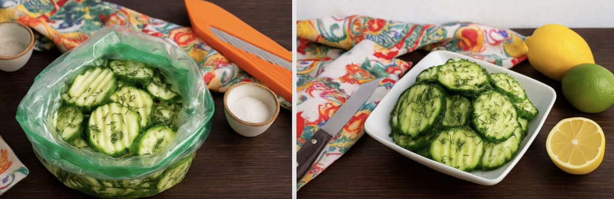 Для тех, кто ценит время, существует экспресс-метод заготовки кабачков. Нарезанные тонкими кружочками кабачки смешивают с измельчённым чесноком, петрушкой, растительным маслом, солью, сахаром, лимонным соком или яблочным уксусом, а также чёрным перцем. Все укладывают в пакет с застёжкой и тщательно встряхивают. Через 15–30 минут готовую закуску можно подавать к столу.