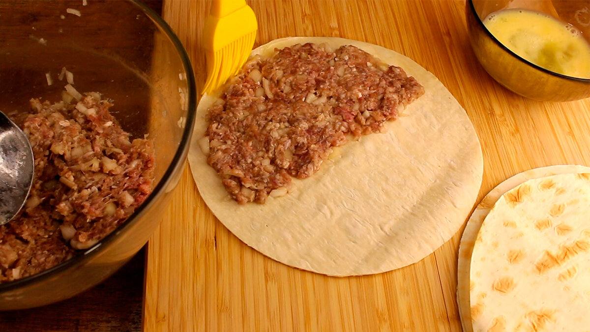 Для формирования заготовок из лаваша используют тарелку с подходящим диаметром и острый нож: из листа вырезают круглые заготовки — обычно получается шесть штук. Затем фарш равномерно выкладывают на половину круга, отступая от края около одного сантиметра. Край смазывают взбитым яйцом, чтобы при складывании лаваша он хорошо склеился и начинка не высыпалась. Второй половиной круга накрывают фарш и плотно прижимают края, освобождая дополнительно воздух.
